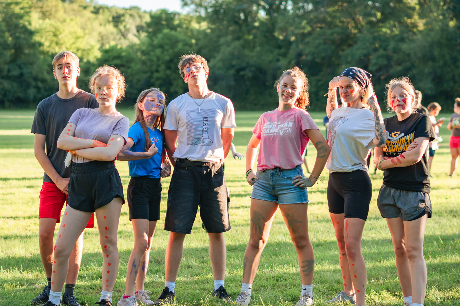 It’s a game called Color Wars, and it is basically a complicated version of tag. Yes, you heard that correctly. It’s tag. But not just any game of tag! Campers paint their faces in elaborate ways. Some will have giant red handprints; others will have yellow dots running down their arms. Some will have green slashes across their cheeks and foreheads; others might paint giant purple hearts all over their faces. People are very attached to their team colors and will request to be assigned Green, Blue, or whatever their favorite color is. Sometimes, I think the paint is the part people like the most.